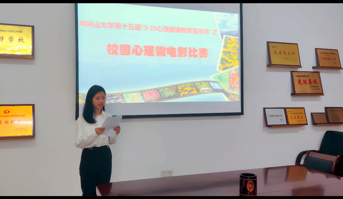 4月14日下午,井冈山大学第十五届“5·25心理健康教育宣传月”之“筑阳光心理、扬青春梦想”校园心理微电影比赛在学工处会议室进行。此次比赛的目的是为了加强我校心理健康教育工作,展示当今大学生的青春风采,体现青年学生对青春、梦想的感悟,共筑阳光心理、传递青春正能量,让全校师生共同了解心理健康、关注心理健康,为心理健康教育工作的开展创造良好的氛围。