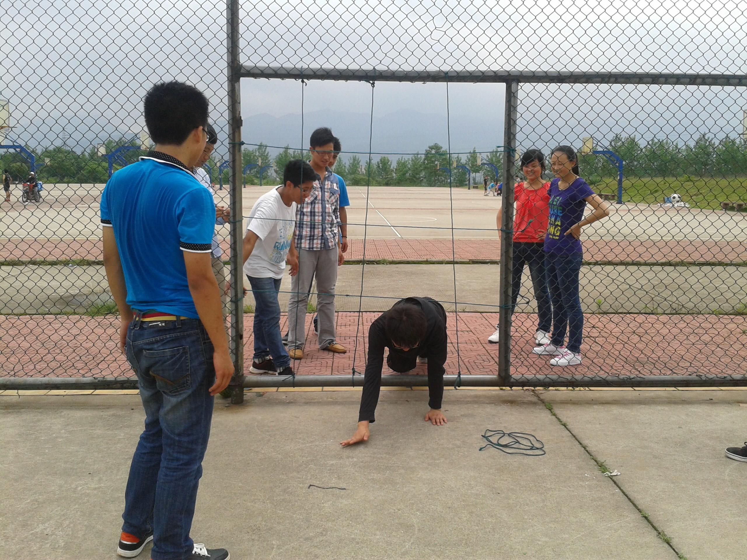 穿越电网相对来说是难度较高的项目,在辅导员罗书嵩老师的指导下,我们了解了穿越电网的游戏规则和一些训练时的小技巧,各个成员相互配合,团结协作,一遍一遍地尝试,寻找最快最稳的方法来穿越电网。