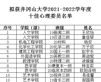 根据《井冈山大学学生奖励实施办法》的规定,经学生个人申请、各学院(部)初选、心理健康教育与咨询中心审核, 拟评选万子欣等14个学生为2021-2022学年度“优秀心理委员”。根据视频评选和现场竞选两轮比赛,拟评王欣怡等11个学生为2021-2022学年度“十佳心理委员”。