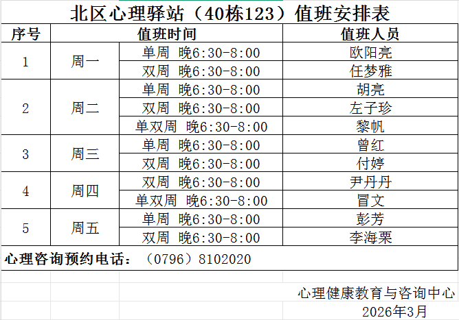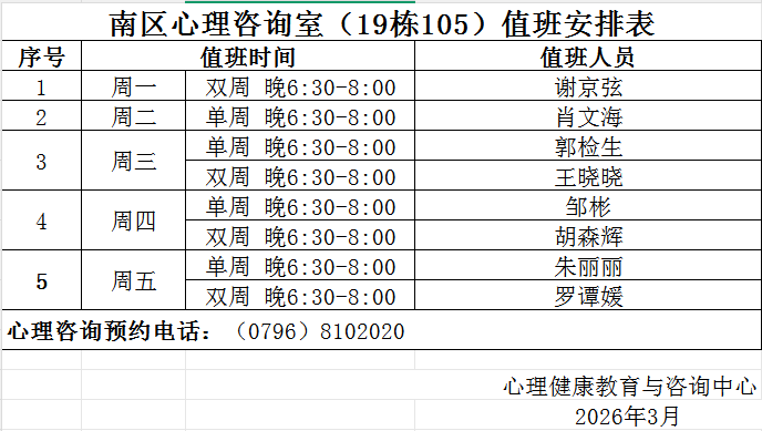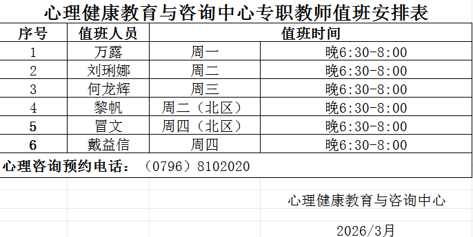 寒假线上心理咨询值班安排表(2026年1月-2月)