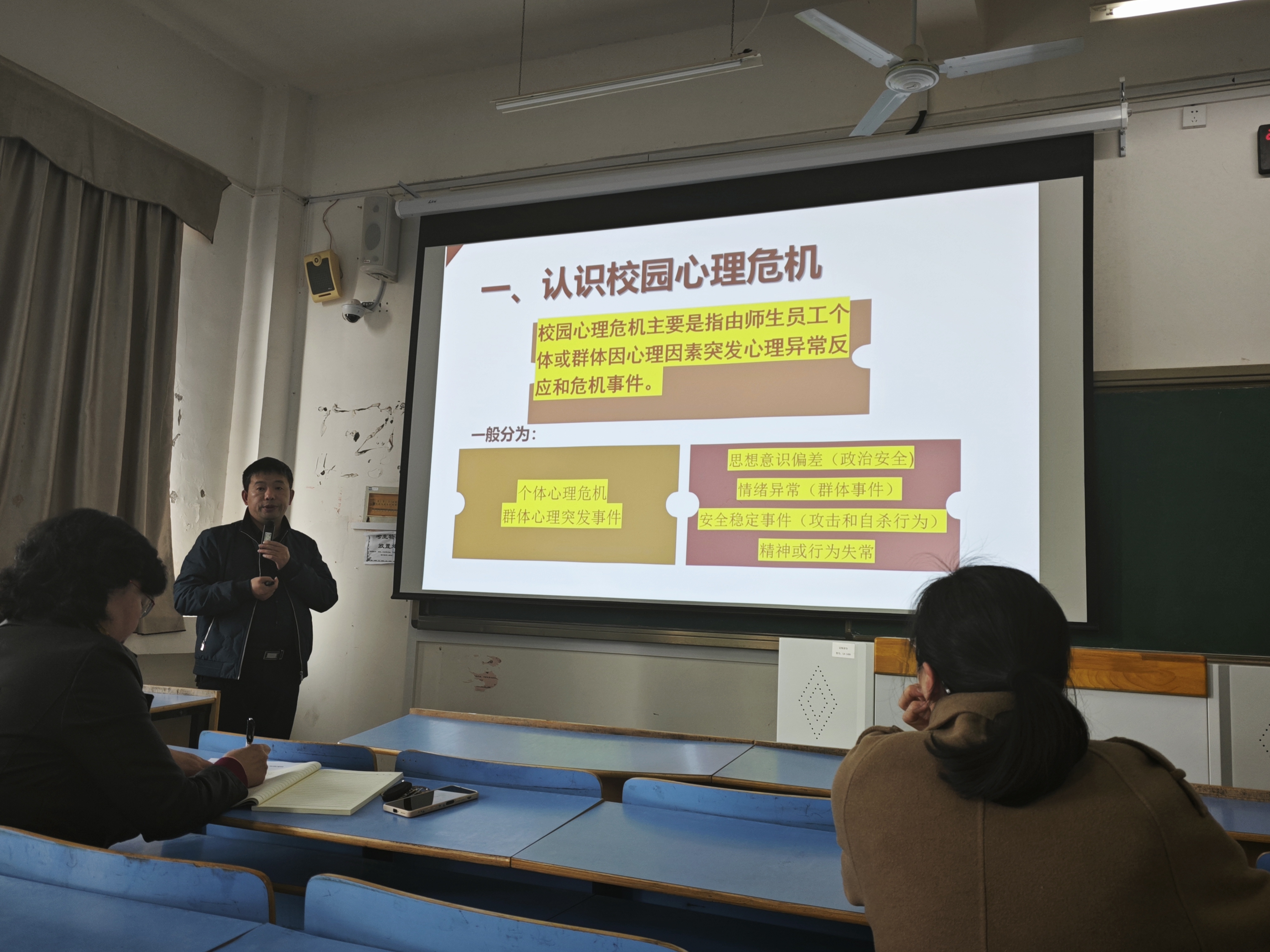 戴益信以认识校园心理危机、发现校园心理危机、谈心谈话和帮扶、建档、反馈和跟踪四个方面对全体教职工进行了讲解。他结合相关教育案例,分析了大学生的心理特征和常见的心理行为问题,围绕心理危机识别与应对策略等方面进行了指导,并从专业的角度剖析问题产生的根源,提出有效的心理危机应对的办法,为全体教职工及时识别、科学预防学生的心理健康问题提供了专业指导。