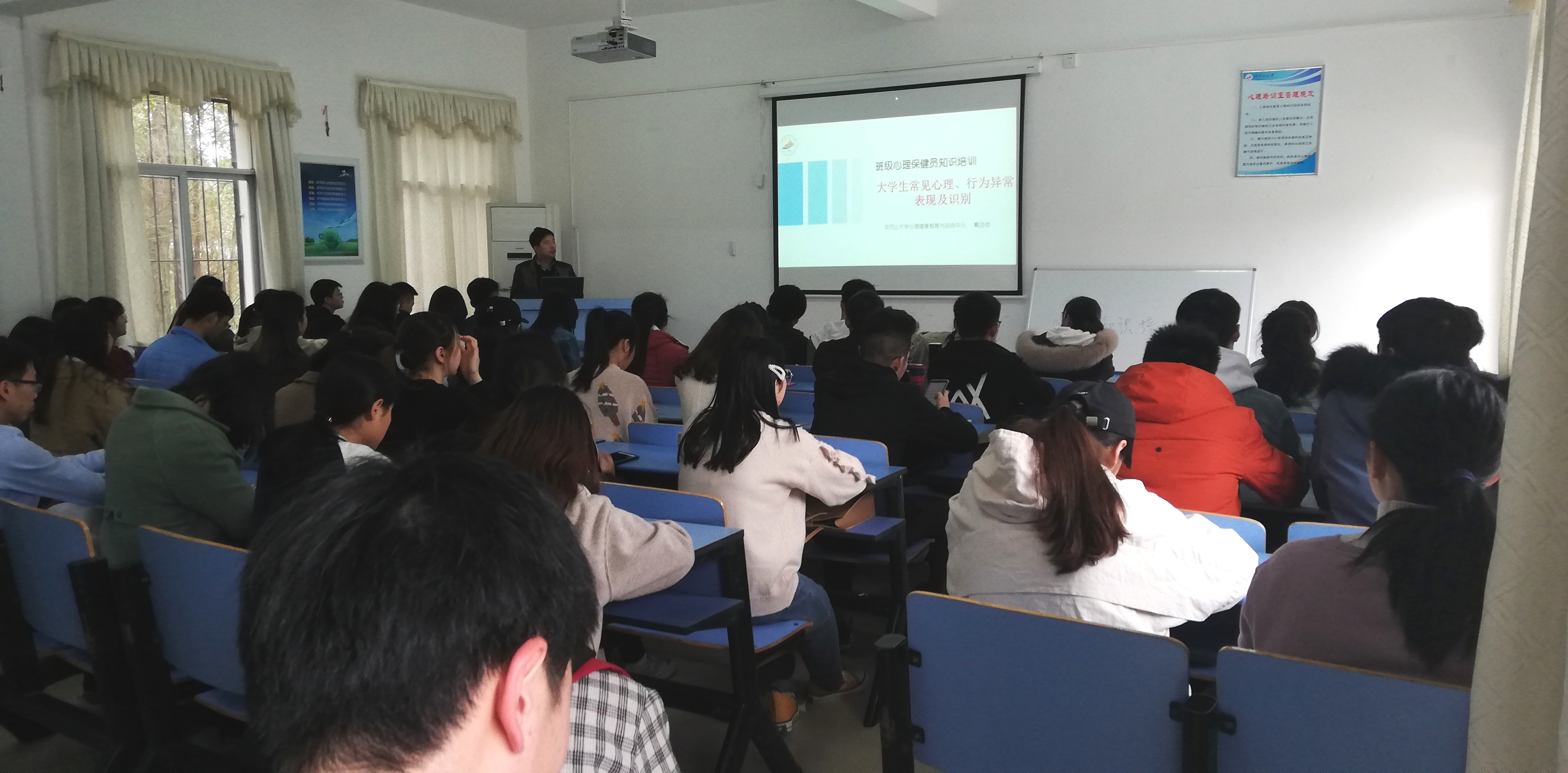 为提高班级心理保健员心理健康知识水平,提升班级心理保健员对心理异常的辨识能力,进一步完善学校学生心理危机预警,心理健康教育与咨询中心于3月14日为全校2018级和部分2017级、2016级班级心理保健员开展了“大学生常见心理、行为异常表现及其识别”心理健康知识专题培训,讲座由心理健康教育与咨询中心戴益信老师主讲,共计100余人到场聆听。