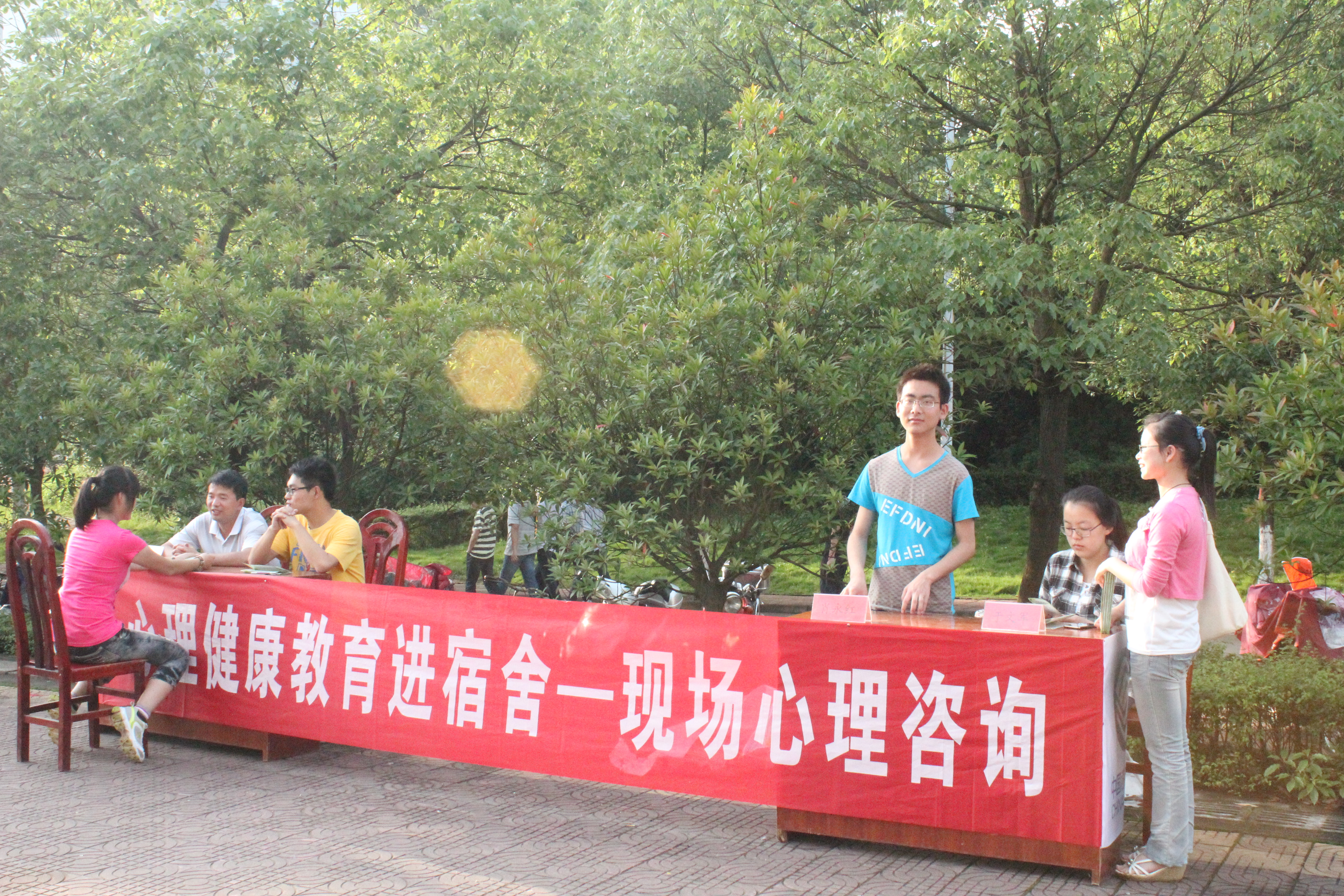 5月20日下午,心理健康教育与咨询中心在学校宿舍区开展以“关注心理健康,拓展心理素质”为主题的心理健康教育进宿舍活动。活动主要分现场咨询、散发心理健康教育宣传册。活动现场心灵服务队的队员向来往同学散发心理健康宣传教育册。许多同学到咨询台要求咨询,心理咨询教师给同学进行咨询辅导,主要解决学生中专业困惑、学习规划等问题,很多同学反映接受老师指导后,认识到自己在成长过程中有不足,感到受益匪浅。