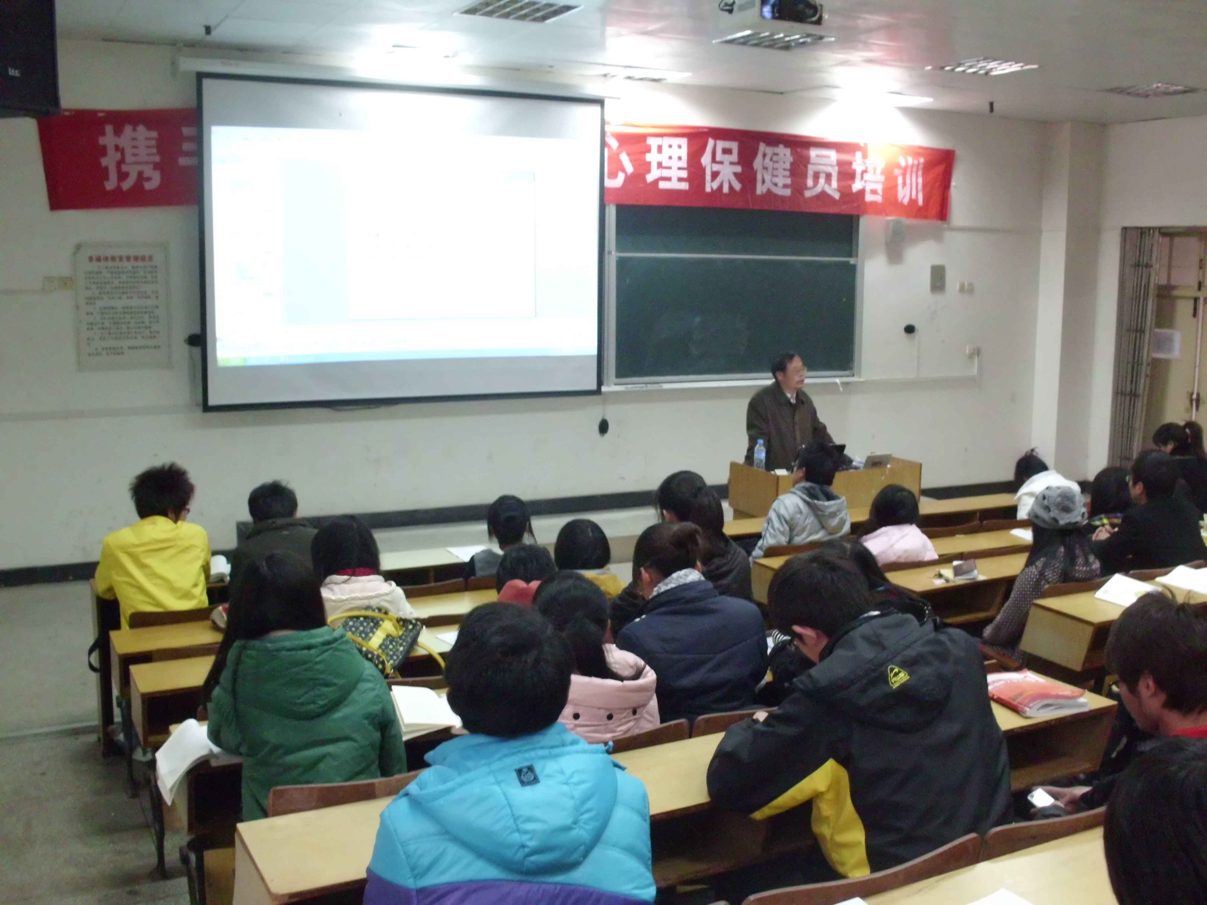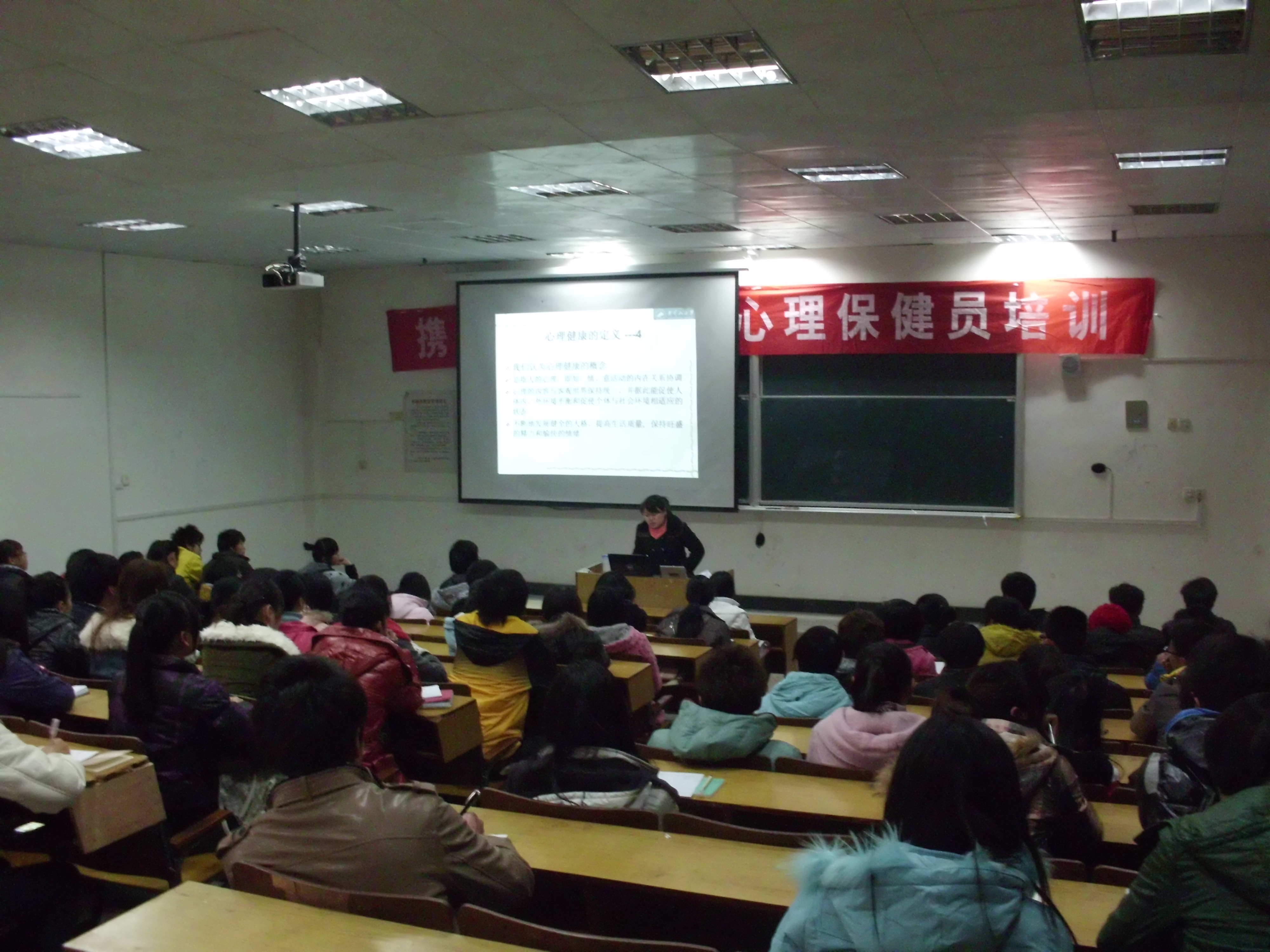 12月22日下午,学生工作处在5栋205教室举行2011年第五期班级心理保健员专业知识培训。参加此次培训活动的人员有学工处心理咨询科全体人员和2011级班级心理保健员共计100余人。