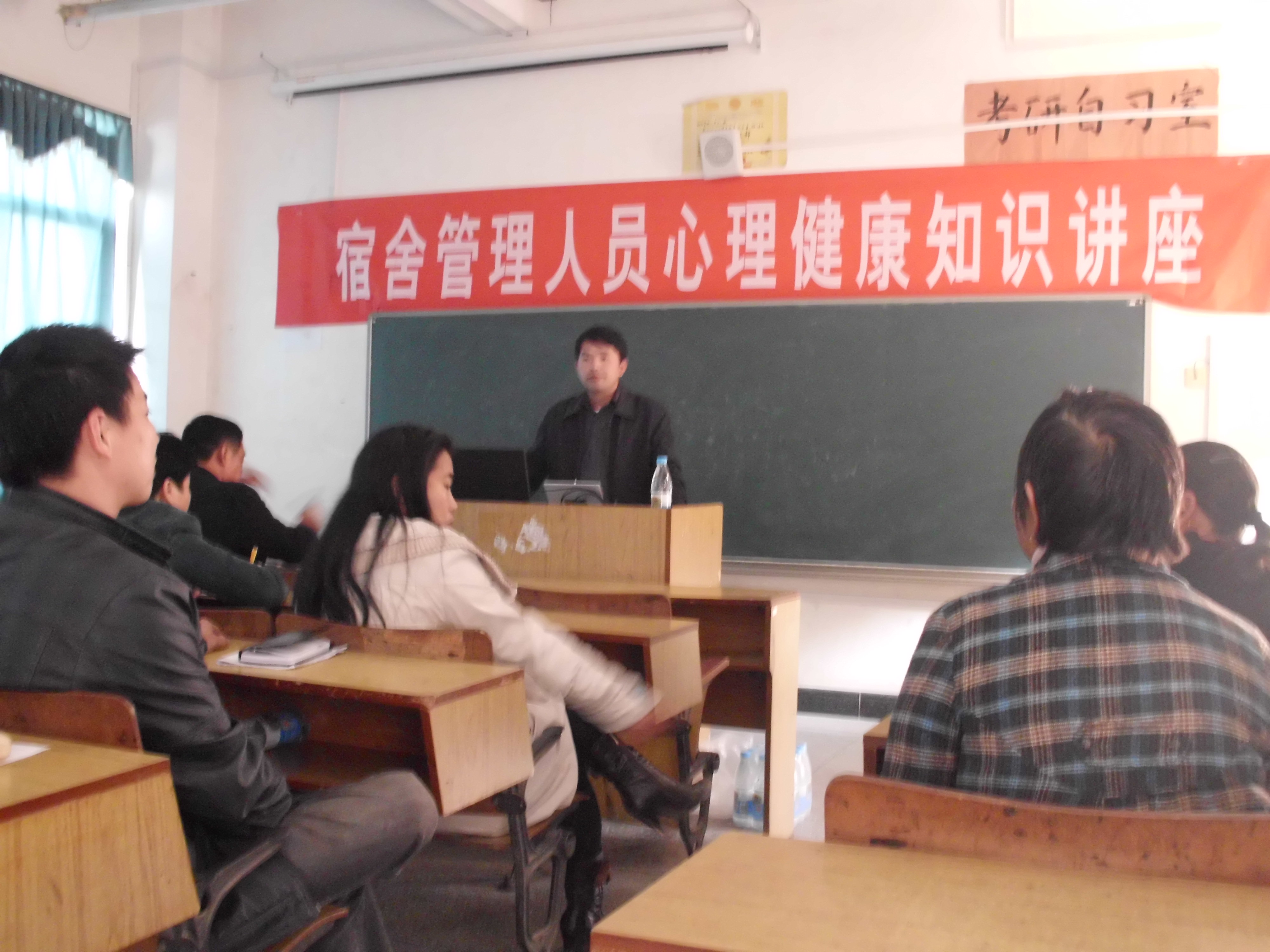 11月23日下午,我校学生工作处和后勤服务集团组织宿舍管理人员在5栋教学楼403室开展心理健康知识讲座。讲座由学生工作处心理咨询科戴益信老师主讲,后勤服务集团宿舍管理工作主要领导和各宿舍片区长共30余人参加了此次讲座。此次讲座的主题为“大学生心理异常表现及其应急机制”。戴益信老师强调了宿管人员了解心理健康知识的重要性,通过案例分析讲解了大学生心理异常的表现,并探索了宿管人员在心理危机的应急过程中的主要工作内容和求助途径。讲座进行了近两小时,取得完满成功。