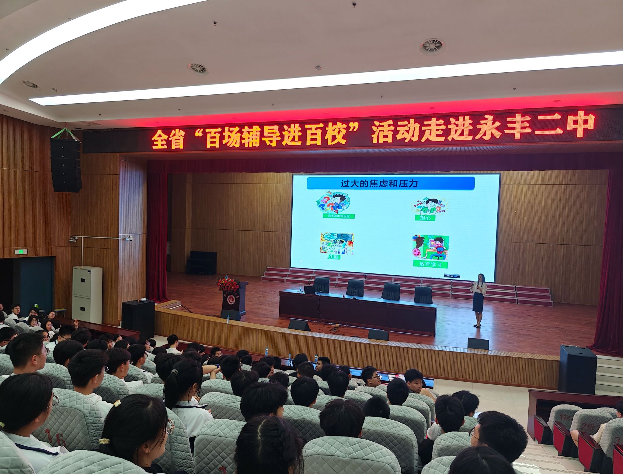 5月12日,由江西省文明办、江西省教育厅主办的全省“百场辅导进百校”活动走进永丰县第二中学,江西省青少年心理健康教育辅导队成员、我校心理健康教育与咨询中心专职教师刘琍娜老师为高三年级学生开展了一场题为“缓解考试压力、疏导焦虑情绪”的心理健康教育讲座,旨在帮助同学们调适和排解心理上的困扰,使大家以积极健康的心态迎接高考。永丰县第二中学李文梁副校长、高三年级组长戴贻亮主任、学校心理老师及高三学生代表共300余人参加活动。