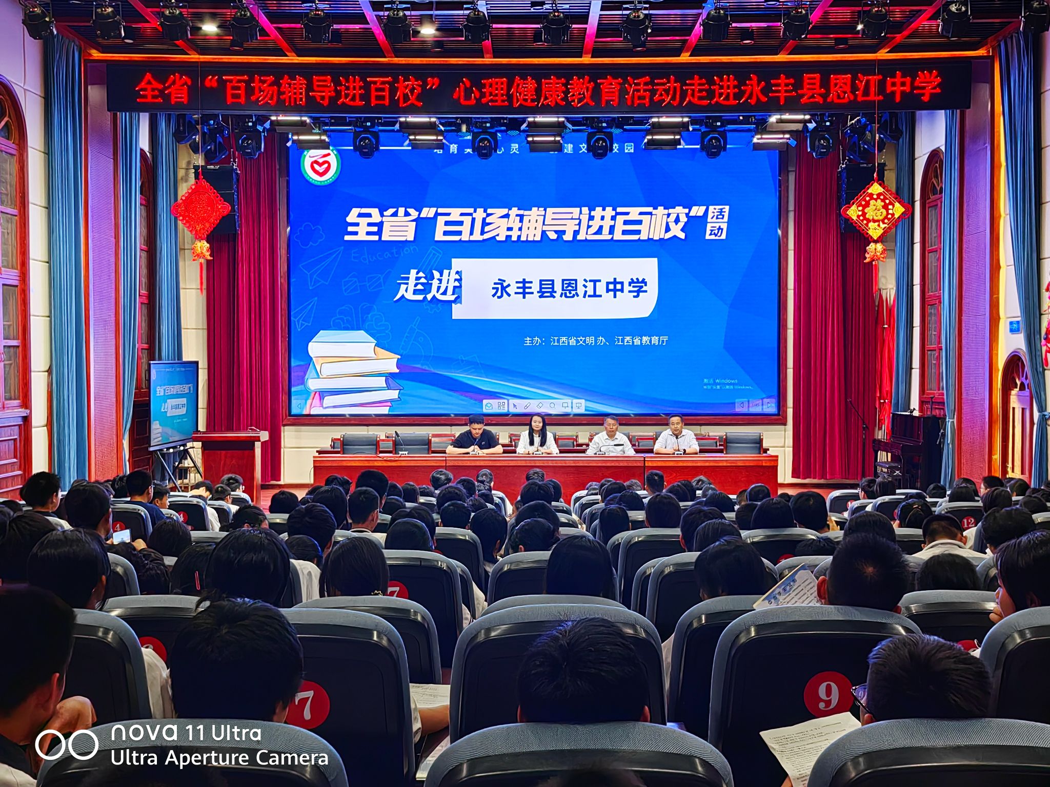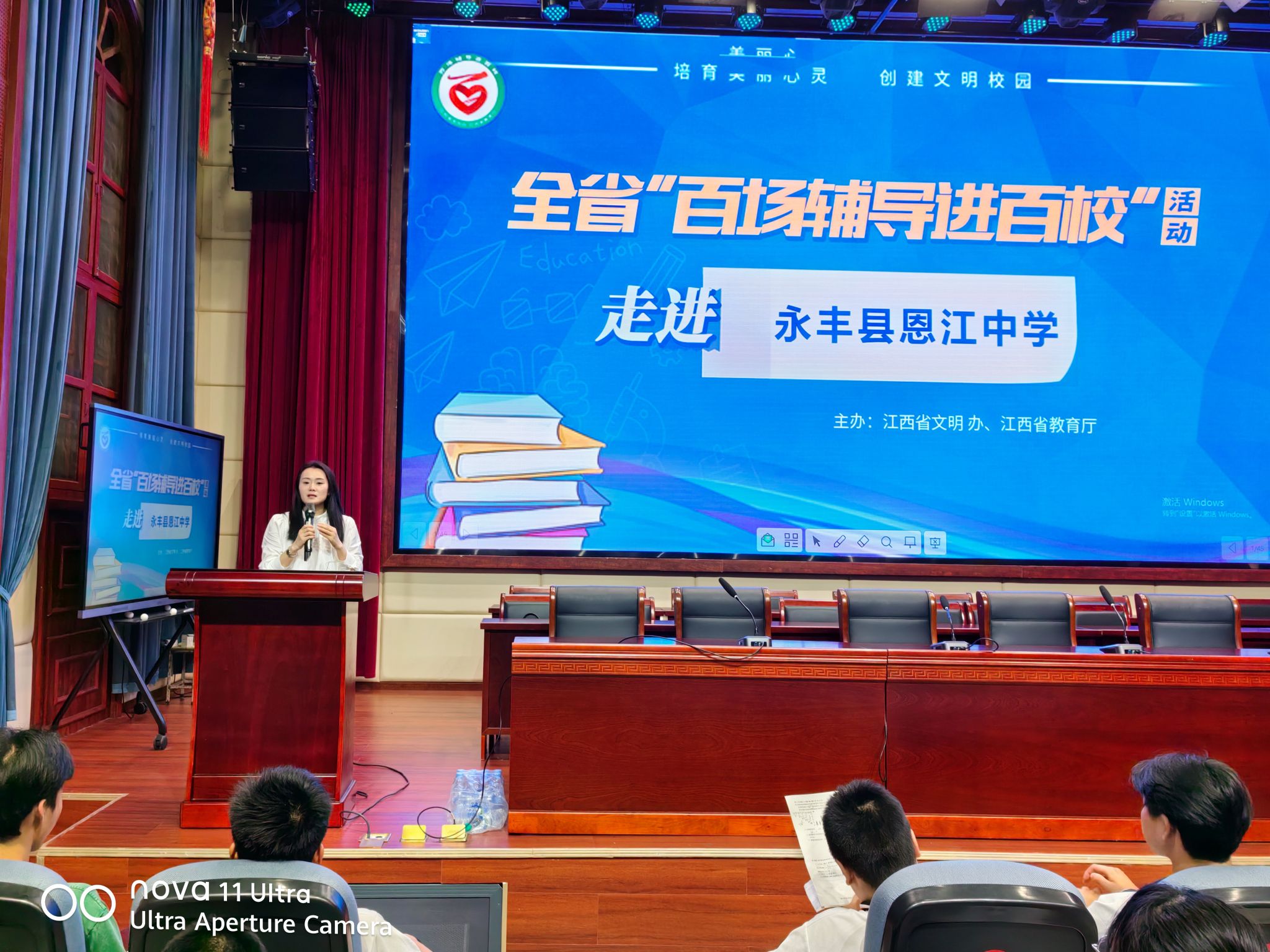 5月11日上午,由江西省文明办、江西省教育厅主办的第四届“百场辅导进百校”心理健康教育实践活动,在吉安市永丰县恩江中学报告厅举行。我校心理健康教育与咨询中心专职教师刘琍娜为恩江中学九年级260位学生开展了主题为“缓解考试压力、疏导焦虑情绪”的讲座。恩江中学领导高度重视本次活动,党总支书记龚庆根同志出席并全程陪同,校长傅宇同志致辞,副校长王先林同志主持。教务处主任徐文华、办公室主任黄美洋、政治处主任黄芳钧、教务处副主任年级组长邹浙江等行政人员,以及其他老师也参与了本次活动。会场座无虚席。