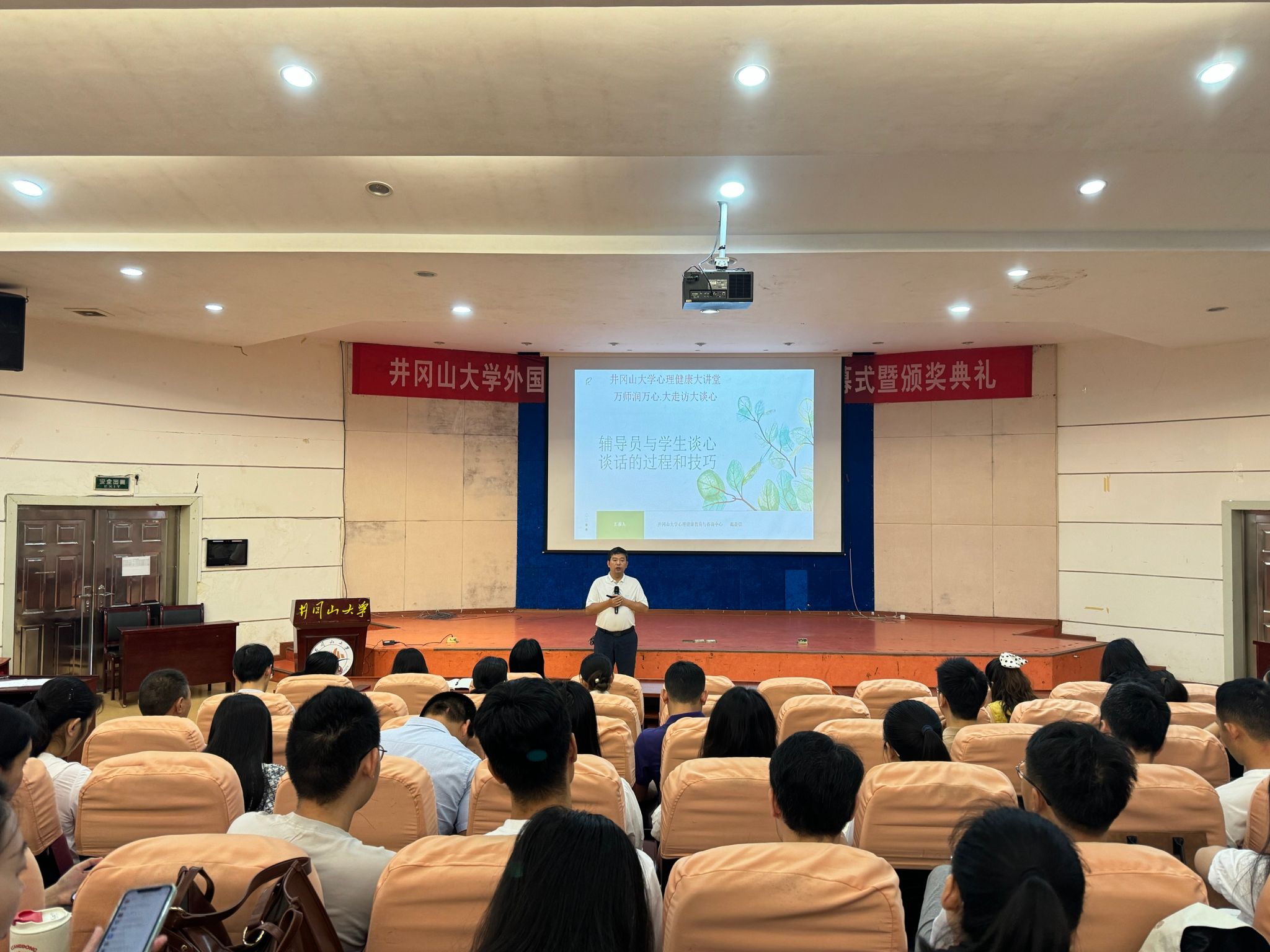 为积极贯彻落实《全省大中小学心理健康教育 “万师润万心·大走访大谈心”活动方案》要求,进一步提升辅导员谈心谈话技巧,6月27日下午,学校在10栋学术报告厅举办心理健康大讲堂第三期活动,本期讲座主题为“辅导员与大学生谈心谈话的过程和技巧”,由井冈山大学心理健康教育与咨询中心主任戴益信受邀主讲。各学院党委副书记、全体专兼职辅导员参加了本次讲座。