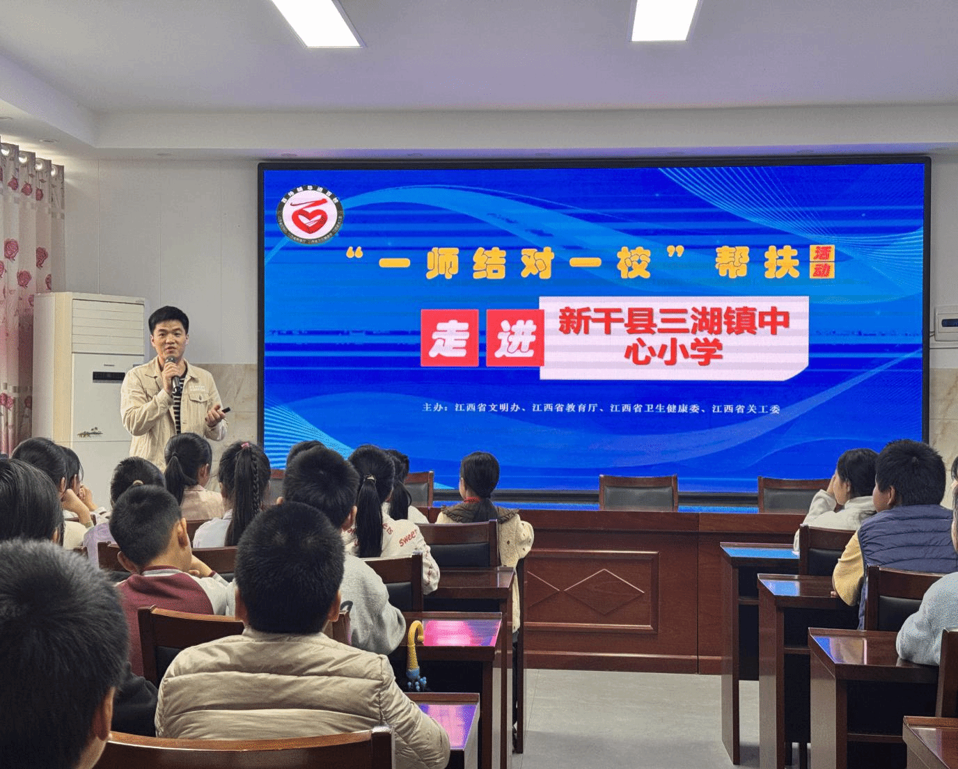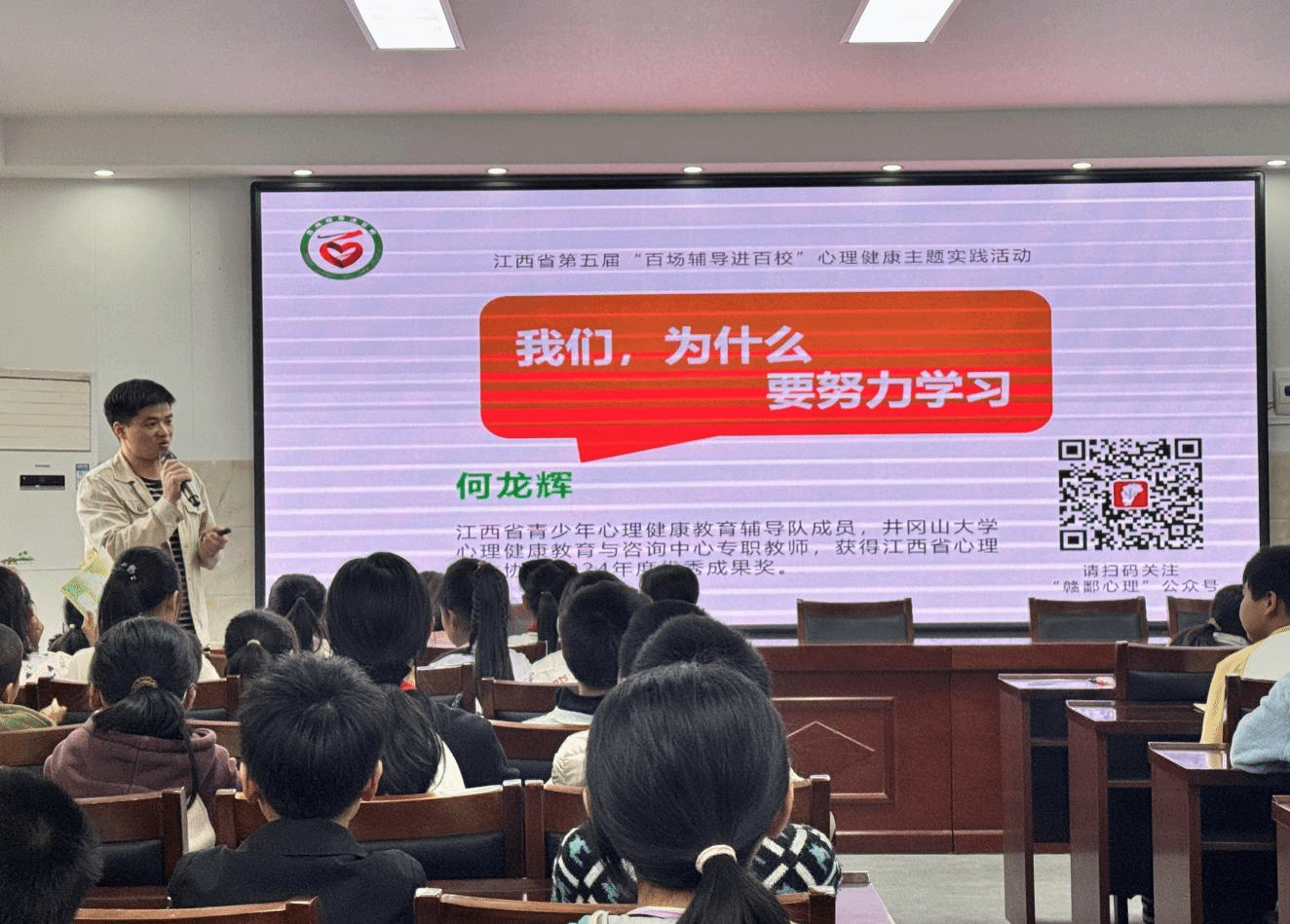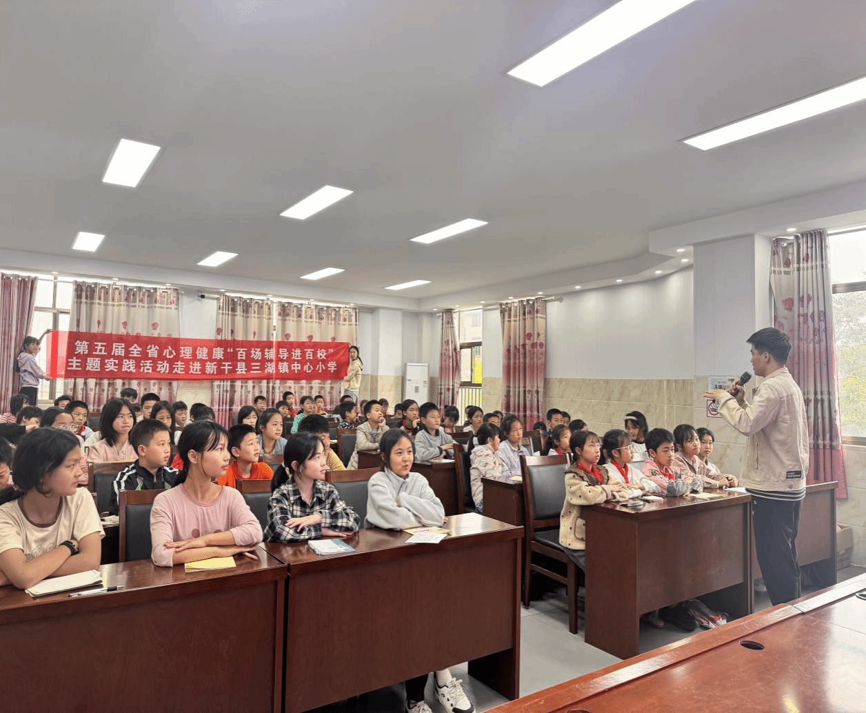 为进一步加强和改进新时代青少年心理健康工作,提升青少年心理健康素养,省文明办、省教育厅、省卫生健康委、省关工委联合主办的第五届江西省心理健康“百场辅导进百校”主题实践活动。于2025年4月24日上午,在新干县三湖镇中心小学多媒体教室进行。本次讲座由江西省青少年心理健康教育辅导队成员、我校心理健康教育与咨询中心专职教师何龙辉老师主讲,该校校长、学校心理健康教师及全体四、五年级学生参加了本次讲座。