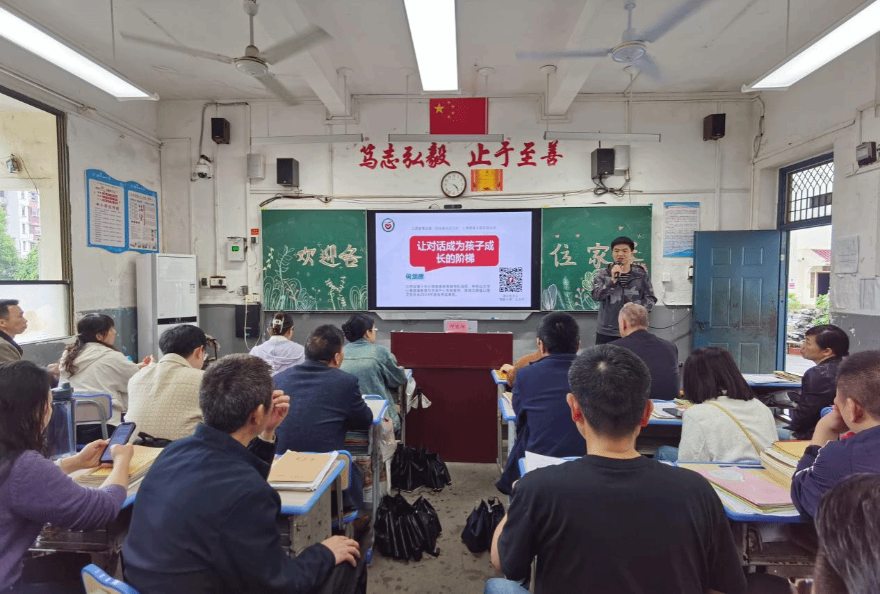 为进一步加强和改进新时代青少年心理健康工作,提升青少年心理健康素养,省文明办、省教育厅、省卫生健康委、省关工委联合主办的第五届江西省心理健康“百场辅导进百校”主题实践活动。于2025年4月27日下午,在赣州市第四中学教室进行。本次讲座由江西省青少年心理健康教育辅导队成员、我校心理健康教育与咨询中心专职教师何龙辉老师主讲,该校德育处主任、学校心理健康教师、班主任及全体初一至高一学生家长参加了本次讲座。