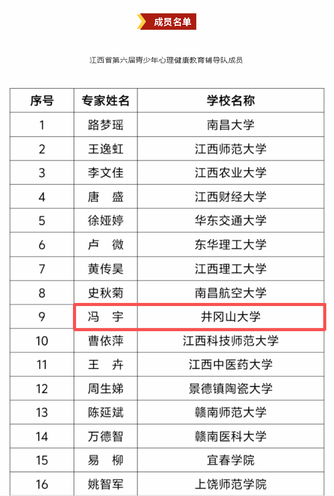 经教师自主申请报名,学校推荐,全省共286位老师报名申请,经过活动组委会办公室审核教师资质,共选拔40名心理健康教育专家成为江西省第六届青少年心理健康教育辅导队成员,我校冯宇老师以政治强、业务精、教学效果好,入选为江西省第六届“百场辅导进百校”辅导队成员。